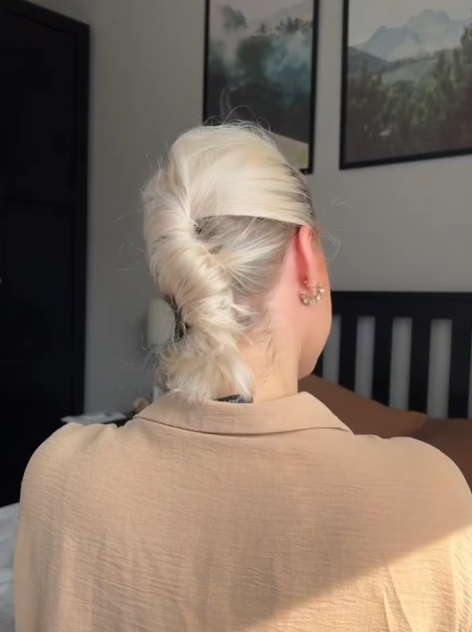 För in nålen genom att försiktigt sära på skänklarna för att fixera frisyren. Skjut den sedan längs med hårbotten för ett säkert och stadigt grepp.